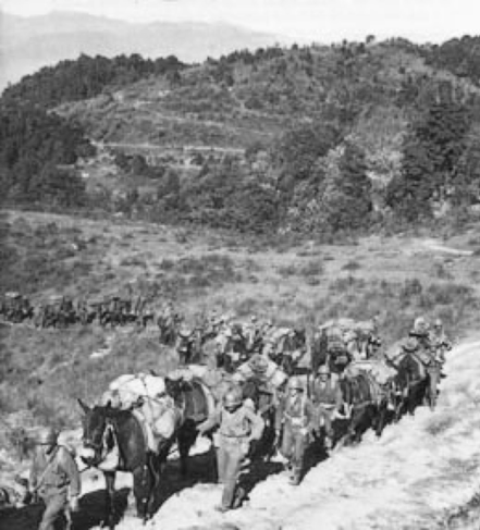 MARS was able to profit by the experience of Wingate’s Raiders and Merrill’s Marauders in Burma jungle operations. The leaven of veteran jungle fighters was mixed with the freshness of volunteers and the assignment of the 124th Cavalry Regiment. A triangular plan was envisioned and in many ways MARS TASK FORCE was truly a Division, consisting of the 475th Infantry, 124th Cavalry (Sp.) and 1st Chinese Regiment. The Cavalry Regiment had a long history of mounted Cavalry and was converted by MARS to Cavalry dismounted, with the functions and employment of an Infantry Regiment. The 475th Infantry was organized by MARS and given official status as a numbered Infantry Regiment by the War Dept. The Brigade itself was organized as a Provisional Unit.